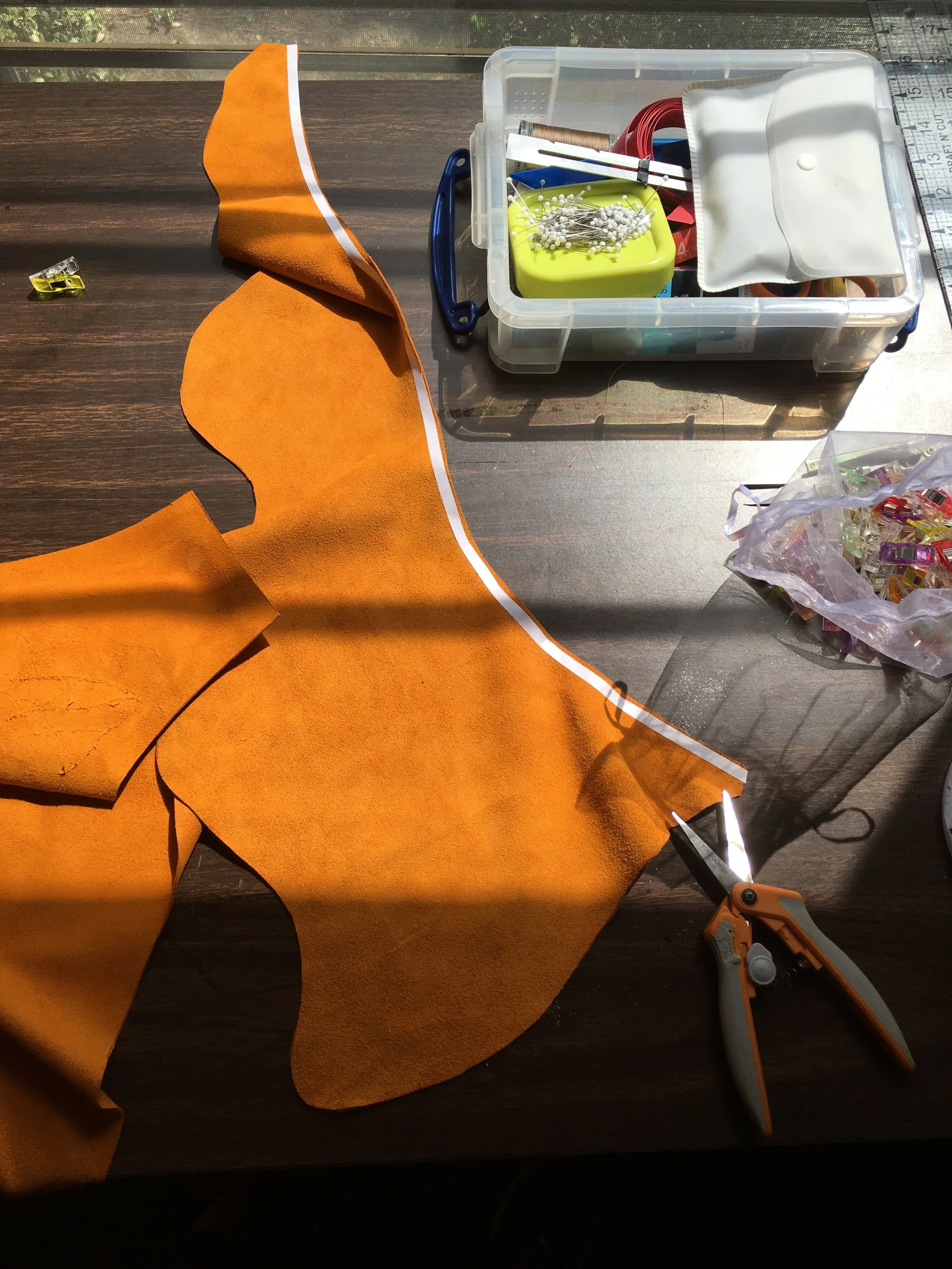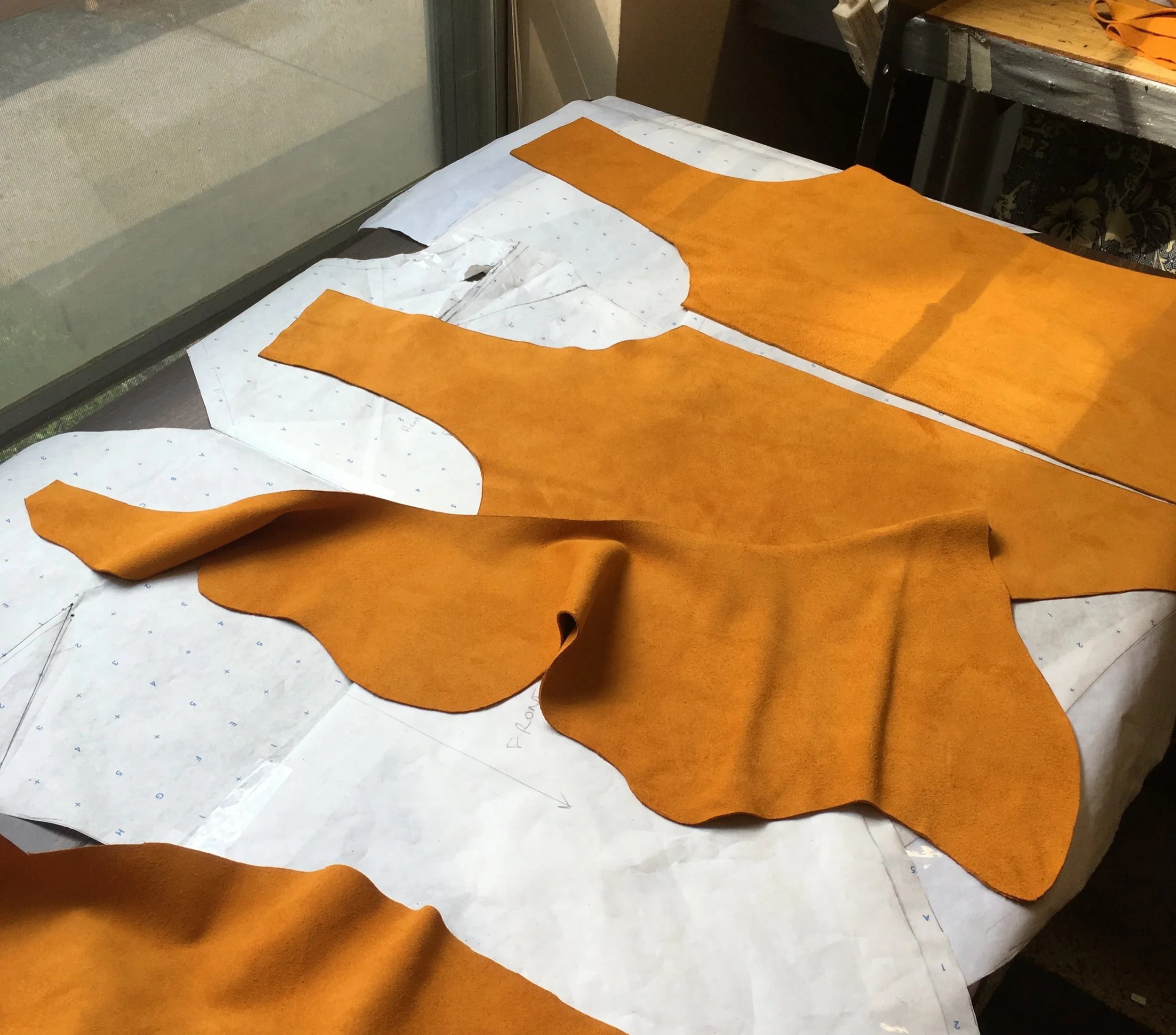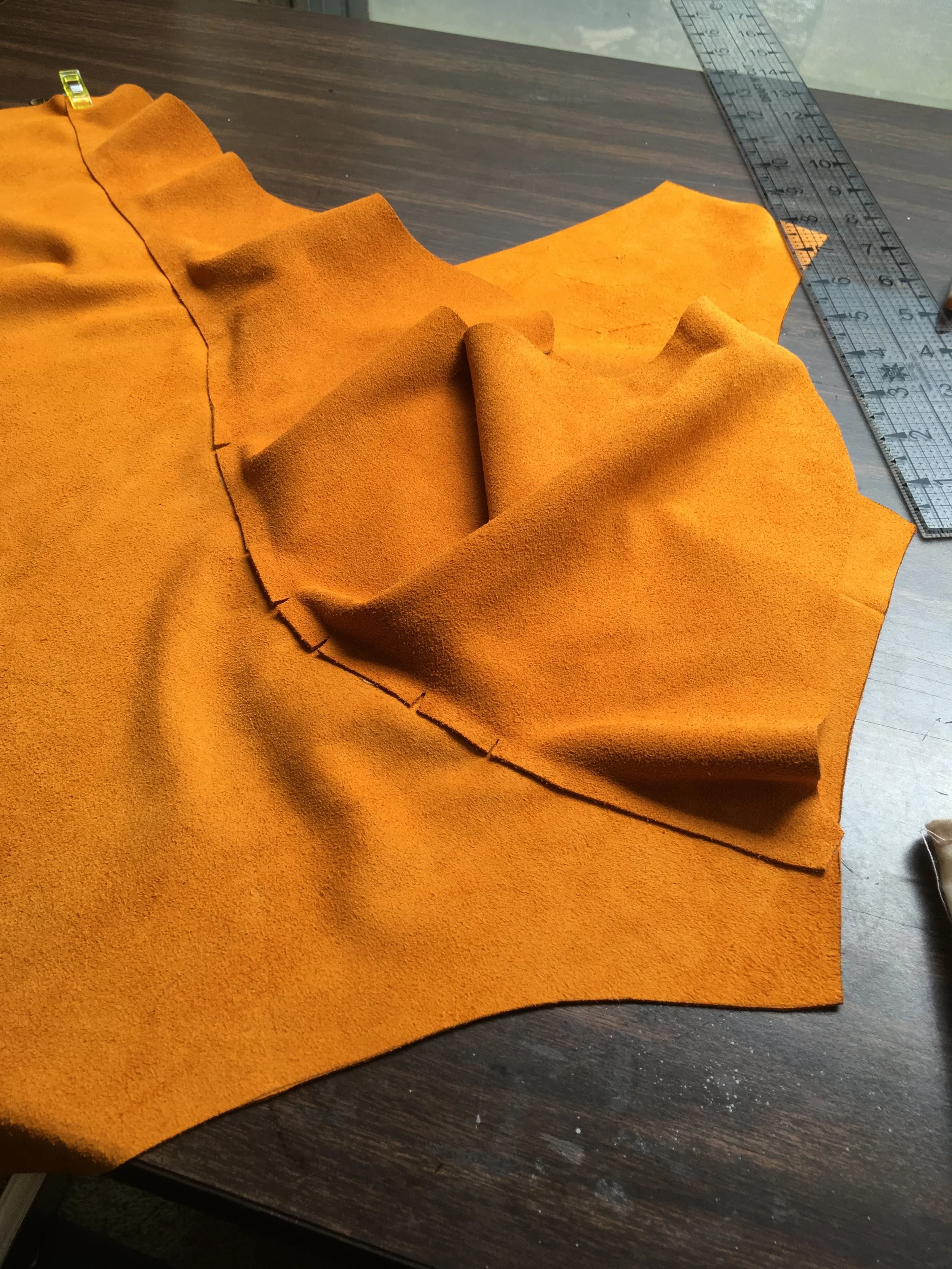 With the fitting and drafting adjustments made over the course of a few weeks, we’re ready to dive into this beautiful leather, a warm golden suede.