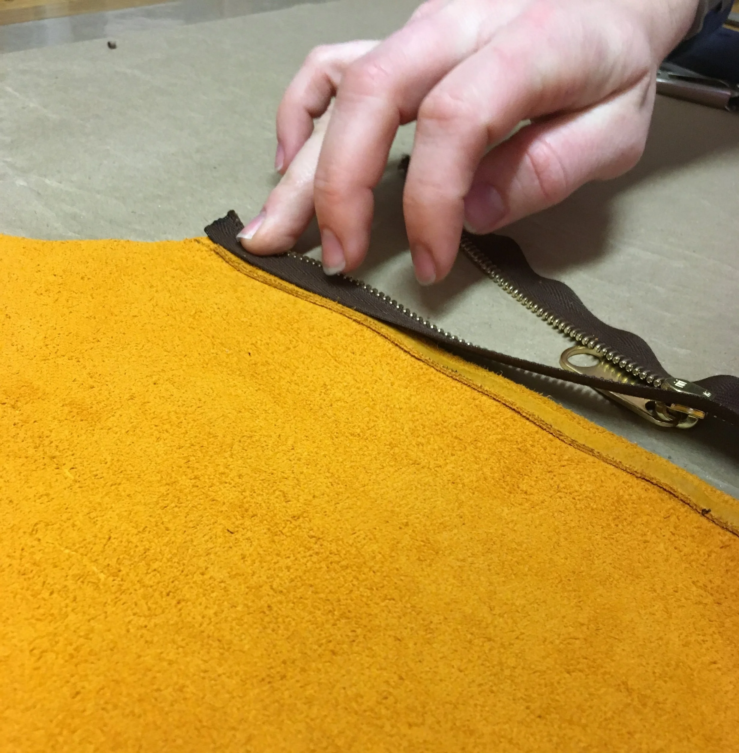 With the backing of the basting tape removed, the zipper adheres firmly to the leather.