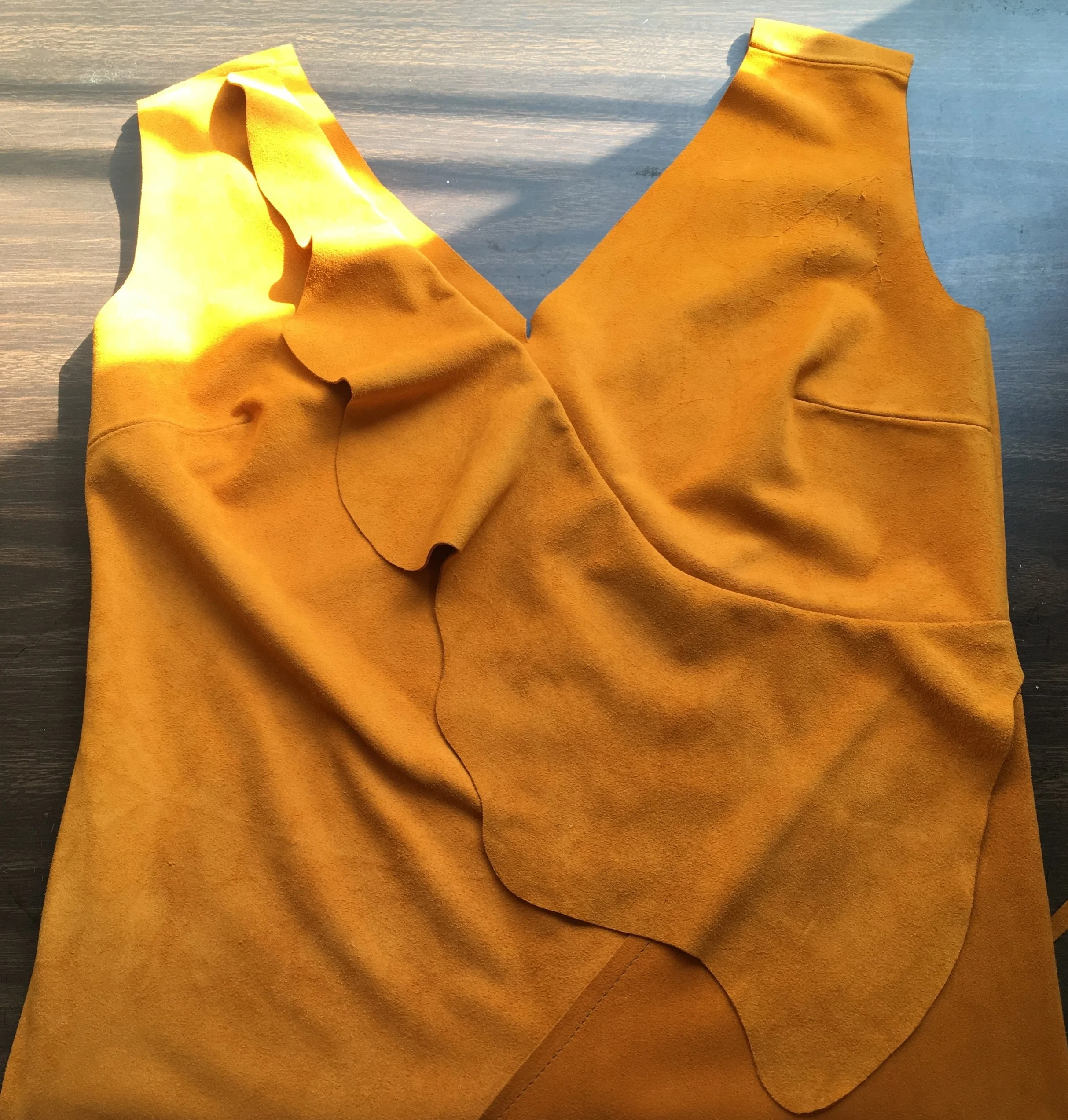 A note on lining: one significant detail about leather clothing that I found during pre-construction research for this dress is that they are often left unlined. First, because there is no issue with frayed threads as there aren’t any, and second; people looking for leather clothing usually appreciate the rough look of the raw cut edge.