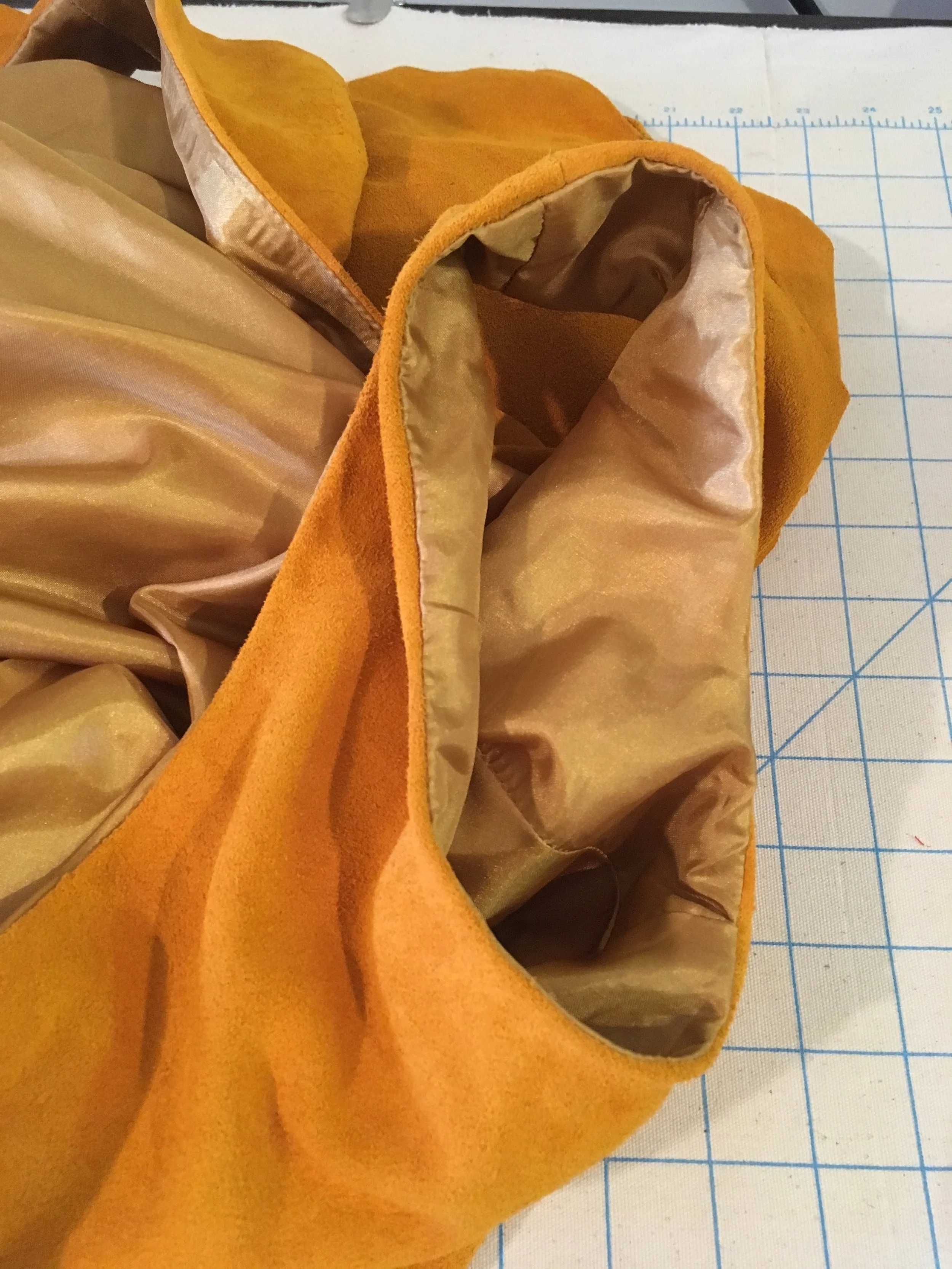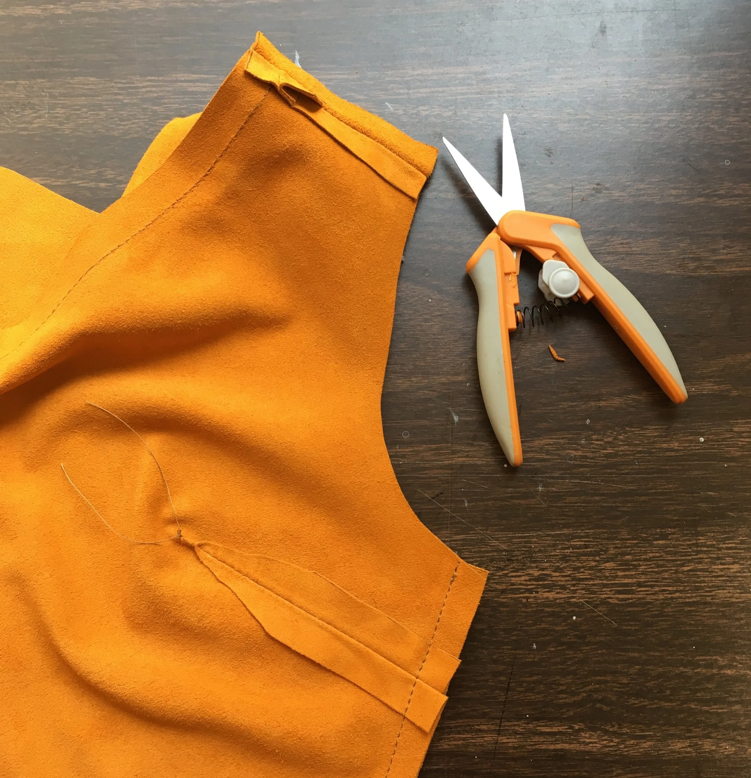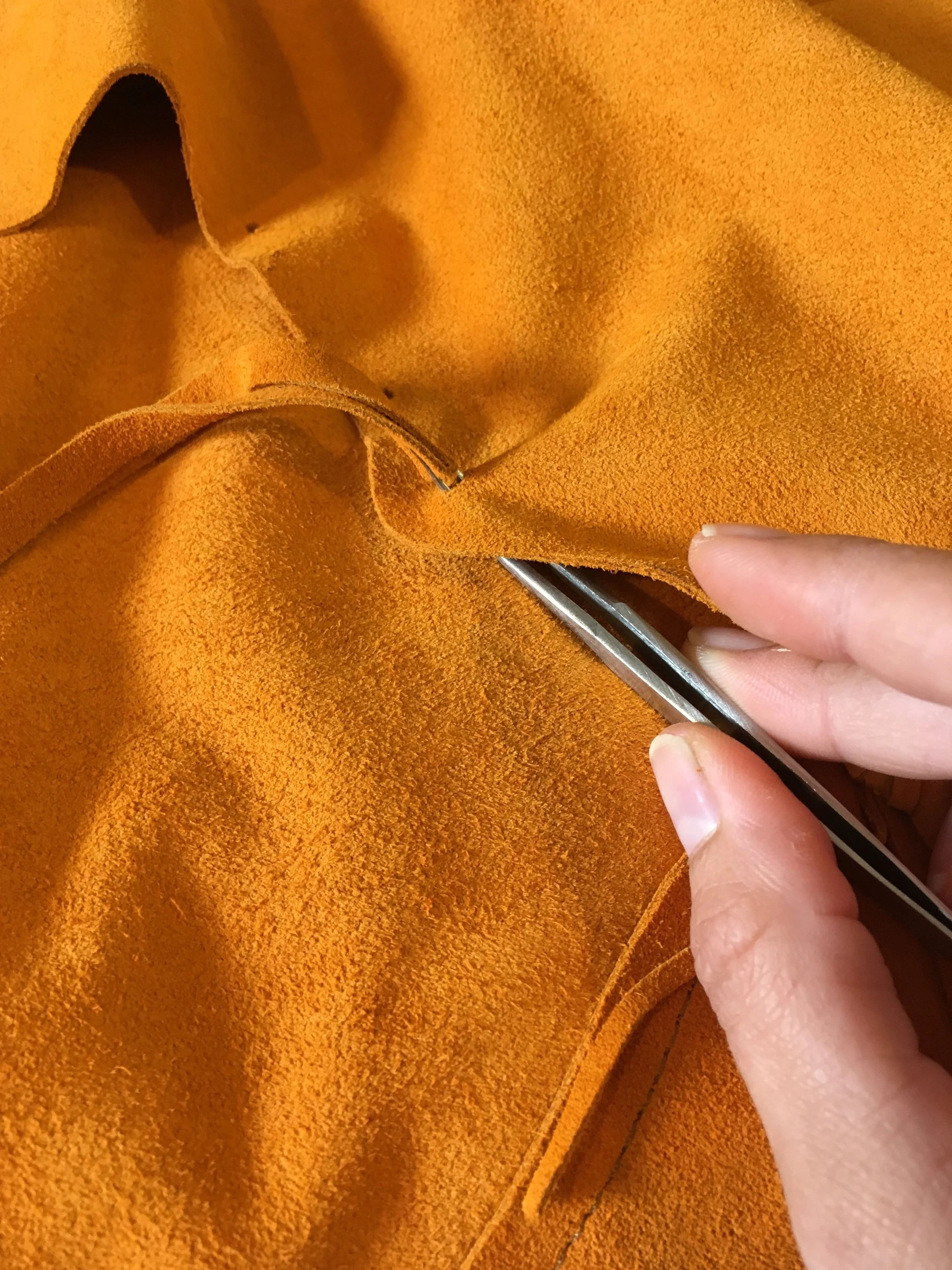 The lining sewn attached to the suede around the armhole, sewn from the inside and then pressed with these handy clips from the outside. No ironing the seams flat in this case!