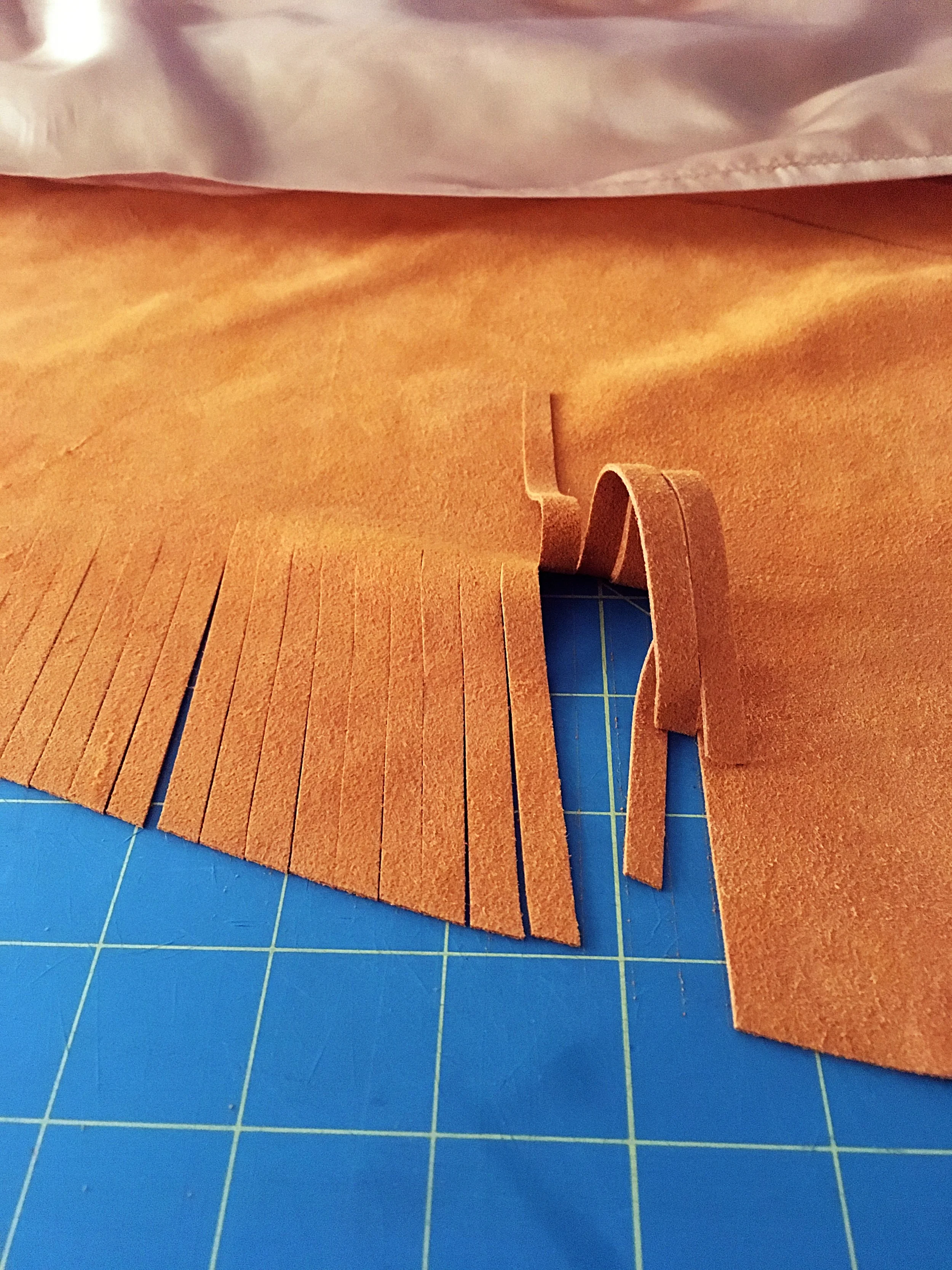 I punched small holes with a borrowed leather punch at random along the front flounce about 3/8” in from the edge. Then I just slid my tweezers in from the back and pulled through a loop of a folded leather stip. (I cut these 1/4” strips earlier while I was finishing up the fringe when I still had my rotary and mat out. I squeeze in the efficiencies where I can!)