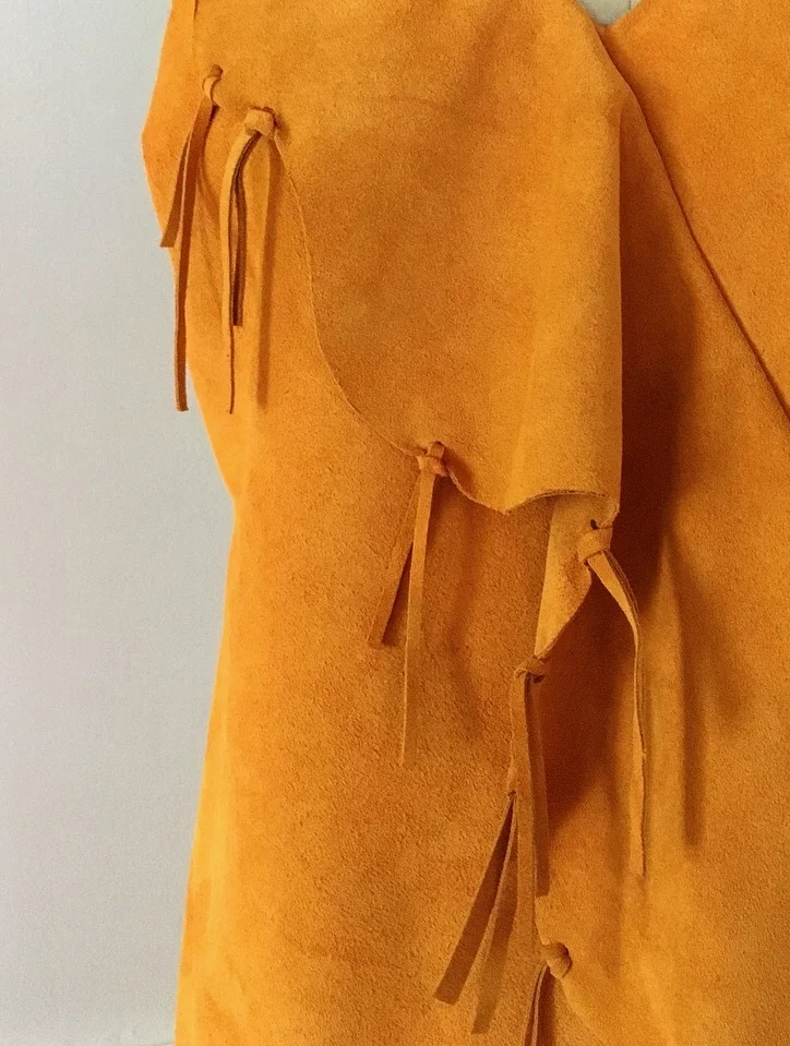 The flat look of the flounce completed. Notice the unique texture of the lether in the upper right corner of the dress. These incredible natural details give this custom dress an even more original look. *You’ll notice quite a few other details are completed in this photo, we’ll walk through them below!
